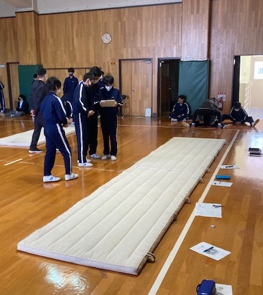 8年生の体育の授業でマット運動がありました。さまざまな種類を行い、アドバイスをしながらタブレットを使っても振り返りやポイントを確認していました。教育支援員の方もお招きし見学していただきました。