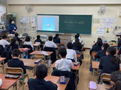 3年生でC−NETの先生とともに、英語の月日を覚える授業がありました。リズミカルな音楽で耳から覚える方法により児童も楽しんで取り組んでいました。