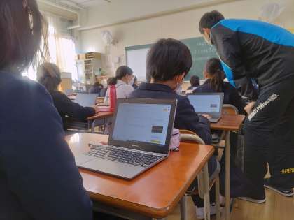 先方の小学生に、3択クイズを出すためスライド作りの練習をしています。ICT支援員さんにもお手伝いしていただいています。