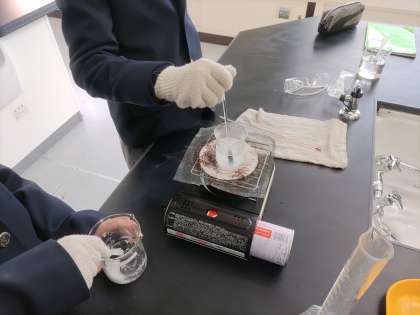 ビーカーの塩が解けていく様子や熱せられて温度計が上がっていく様子など、実験でしか感じられない体験をしています。