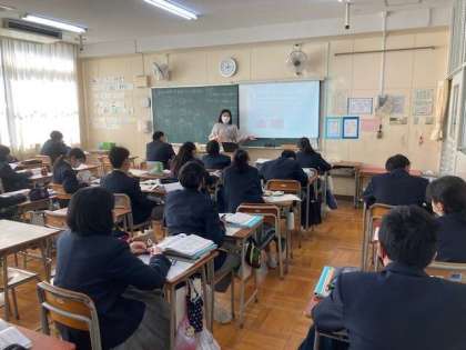 7年生の数学で球の体積と表面積について調べる授業がありました。画面と板書で確認することでその関係性に気づき、ノートにまとめていました。