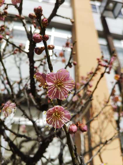梅の花がいくつも咲き、ほのかな香りが壁泉前に漂っています。