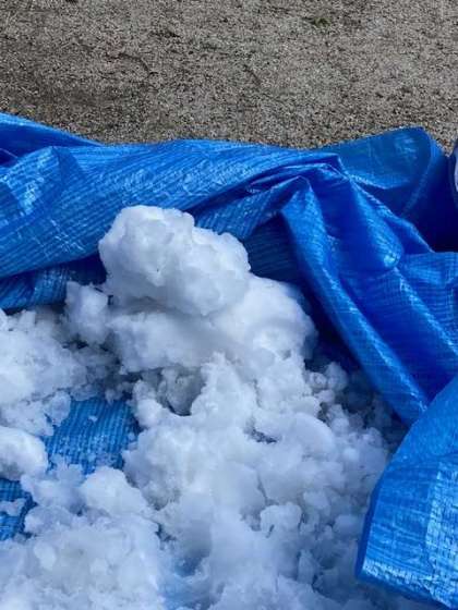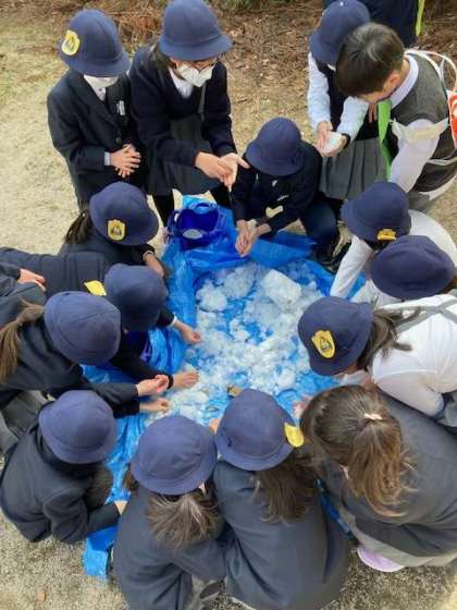 1年生が青森の小学校からの贈り物の雪を実際触っています。歓声とともに何とか雪だるまをつくろうとした児童もいました。冷たさに負けずできたかな?