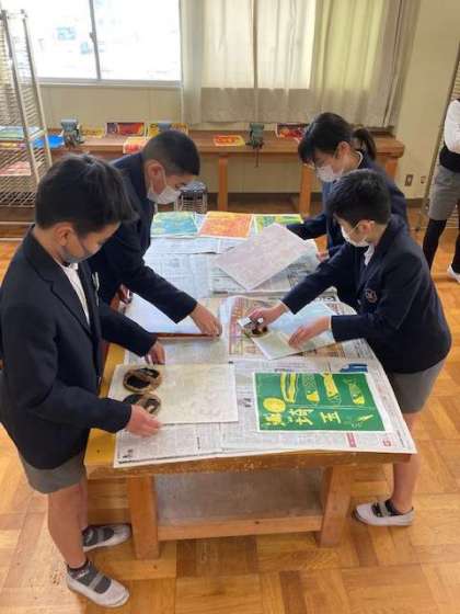 5年生で版画作成の取り組みがありました。皆、上手に削ってきれいに色付けもできていました。完成が楽しみです!