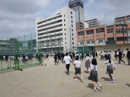 避難の指示から避難場所の運動場に集合するまで4分52秒でした。