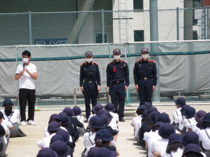 浪速消防署の方も来られ、火災で避難する時は、しゃべらず、煙を吸わず、煙の中は低い姿勢で移動し、緑色の誘導灯がある場合はそれを目掛けて避難し、火災が起きた部屋の戸は閉めるようにとお話しがありました。