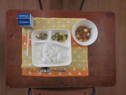 今日は、麻婆豆腐、きゅうりとコーンの甘酢あえ、もやしとピーマンのごまいためでした。