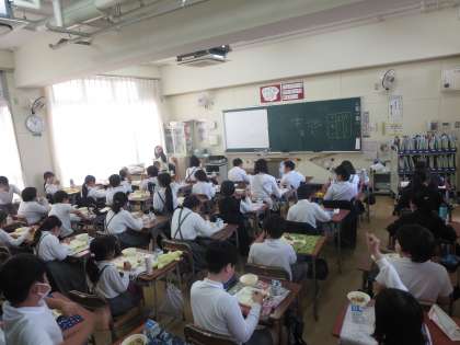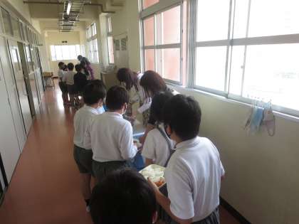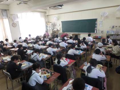 今日のメニューは、まぐろのオーロラ煮、豚肉と野菜の煮物、キャベツの赤じそあえでした。