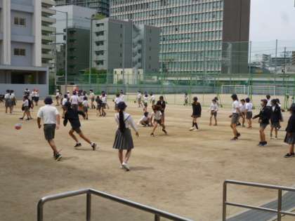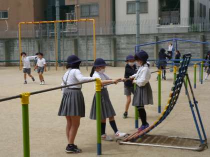 2〜3時間目の間の休み時間、小グラウンドでは元気にドッヂボール、昼休み、内グラウンドでは竹馬や一輪車を上手に乗りこなしたり、鉄棒では前回りを何回もぐるぐると回っていました。