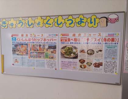 給食室前の掲示物です。ここに全ての学年の係の人が給食を運び出したり片付けをします。