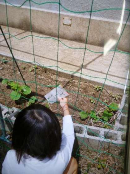 今日はゴーヤに牛乳パックで作ったネームプレートを挿しました。
