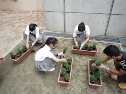 放課後、生徒会で区役所より送られた花を緑化活動として、本校に植える取り組みがありました。マリーゴールドなど数種類を植えています。きれいに咲くのが楽しみです。