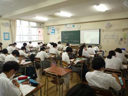 8年生の英語で、日常会話文を動画をつかって紹介する授業がありました。時折動画を止めて、次どのような英語を使うかの問いに悩みながらも答えていました。