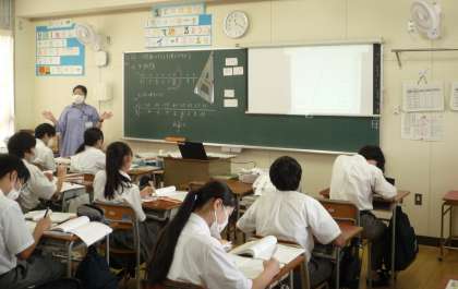 8年生の数学で、一次関数の説明の授業がありました。黒板のグラフを見ながら、実際に線を引いていくつかのパターンを確認していました。