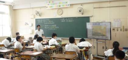 7年生の社会で、稲作の伝統と工業化と関連の話がありました。電子黒板で詳しいデータをみながらそのしくみをノートに記録していました。