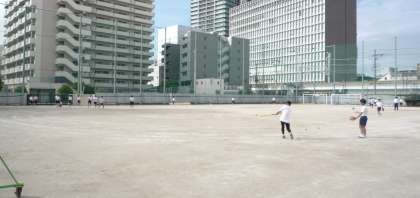 9年生の体育で男子はソフトボールを行いました。元気よく楽しく取り組んでいました。写真はノックをうけているところです。