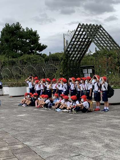 浜寺公園に到着。10:30バラ庭園の前でクラス毎に写真を撮っています。