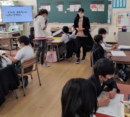 どんなおもちゃにしたいか、グループで話し合って決めています。