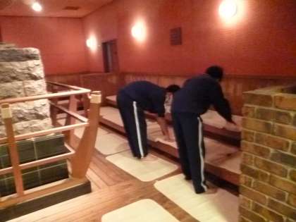 木津市場のお風呂屋さんでの体験です。岩盤浴の暑い部屋の中、マットをきれいに並べ直している様子です。