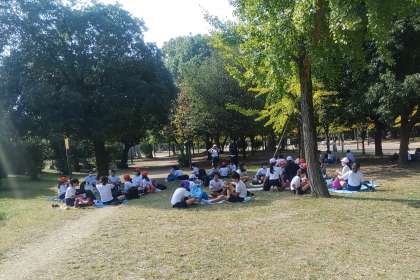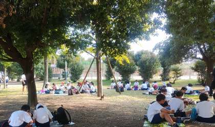 陸上競技場でのプログラムを終え、良いお天気なので芝生でお弁当をひろげています。