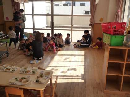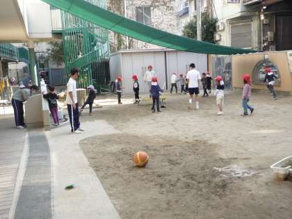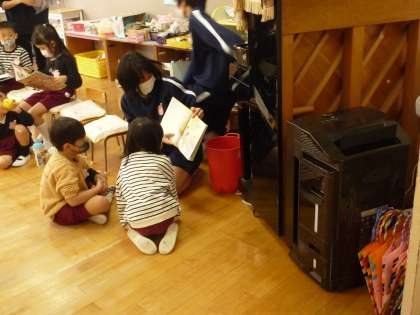 日東幼稚園、愛染橋保育園での様子です。園児たちにとても優しく接してくれていていました。