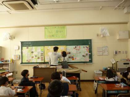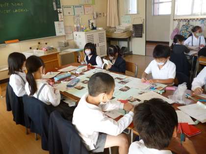 町たんけんで学習したことを1枚の模造紙にまとめています。1組、2組、3組混合で作業を進めています。