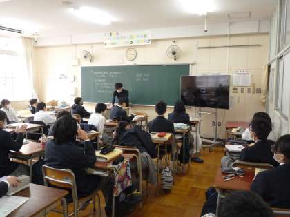 7年生の社会で、歴史の授業がありました。電子黒板をつかって歴史の重要語句について詳しい説明があり集中して見ていました。