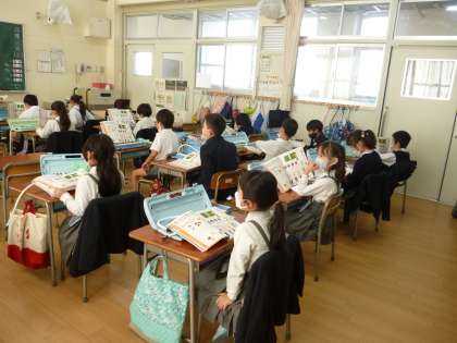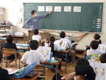 リズムうちの学習をしました。2拍子のリズムで、四分音符、八分音符、四分休符がまじったリズムをうちます。四分音符と八分音符がまじると、少し難しかったようです。