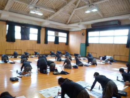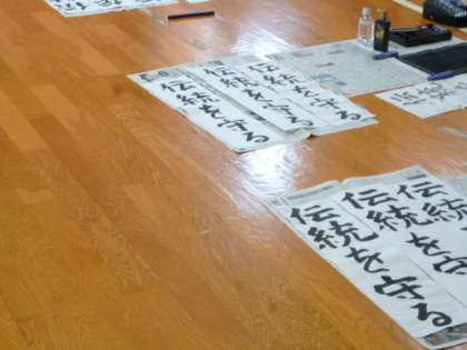 日本の伝統楽器である「琴」の音色が流れる中、「伝統を守る」を書きます。