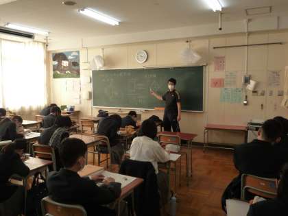 7年生の数学で、立体の投影図についての授業がありました。その名称から形をイメージしつつ、ノートにまとめていました。