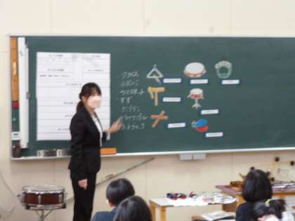 色々な楽器の音を聞いて、好きな音を探しました。好きな楽器を選んでリズムに合わせて演奏しました。