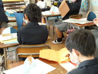 2〜4つの場面に分け、紙で人などをつくったり、絵の具で色をつけたりしています。