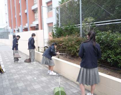 本日、朝の生徒会の清掃活動の様子です。細かいところまで確認し、ごみを回収してくれています。