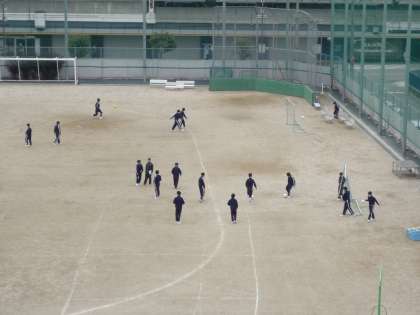 8年生の体育で男子はサッカーの授業がありました。シュートの説明でポイントを確認したあと、寒い中元気にそれぞれでシュート練習に取り組んでいました。