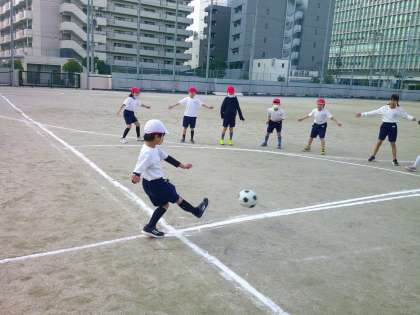 今日の体育では、サッカーボールを使ってキックベースボールをしました。ボールを持ってホームを踏むとアウトになります。