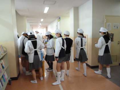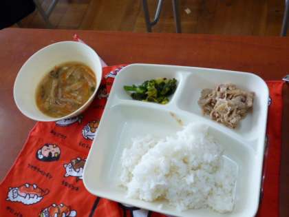 今日の献立は豚肉のしょうが焼き・さつまいものみそ汁・なのはなのおひたし・ご飯・牛乳です。