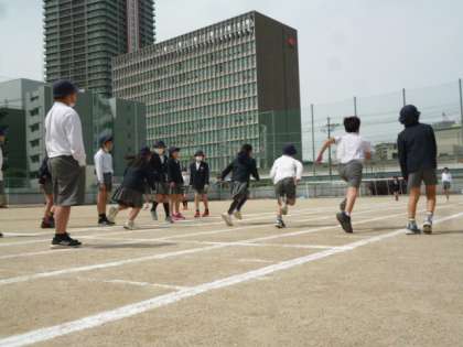 小学校の休み時間、元気に外でかけっこしています。