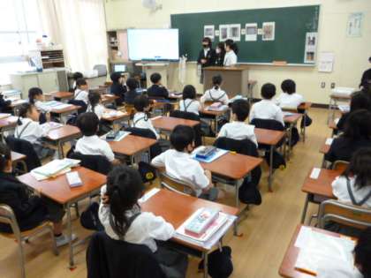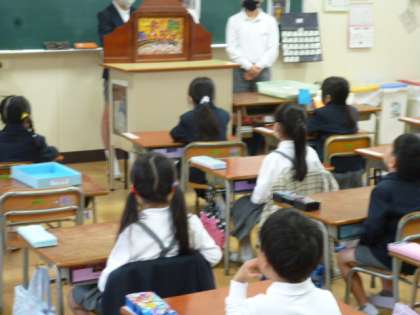 紙芝居やゲームなど、1年生が静かに学習に入れるように、6年生が工夫をしています。