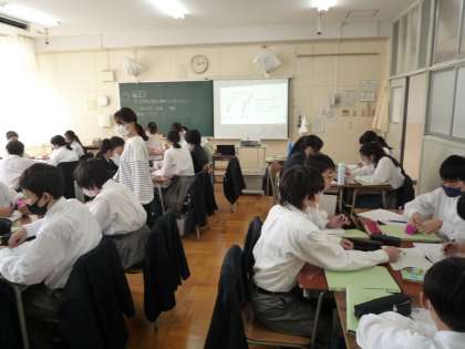 7年生の理科で、植物のつくりを学ぶ授業がありました。グループになり実際にツツジを観察することで、確認しあっていました。