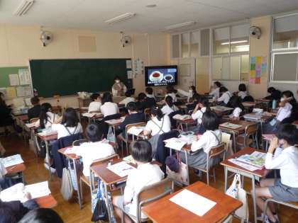 中学校の家庭科の先生が、6年生を教えに来ています。お茶の種類や入れ方について勉強しています。