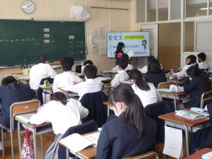 中学校での英語の授業です。肯定文、疑問文、否定文の特徴や違いを見つけています。