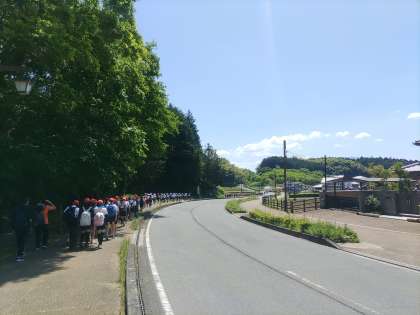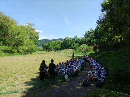 5年生は飛鳥駅に向かって進みます。列車の時間調整で6年生は少し待ちますが芝生広場で走り回ってます。