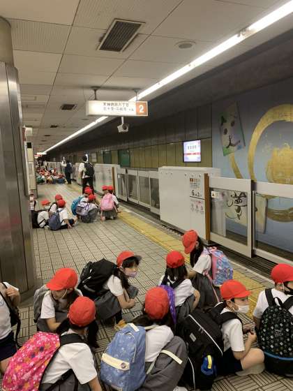 鶴見緑地公園に遠足です。恵美須町駅で8:57分の電車に乗ります。