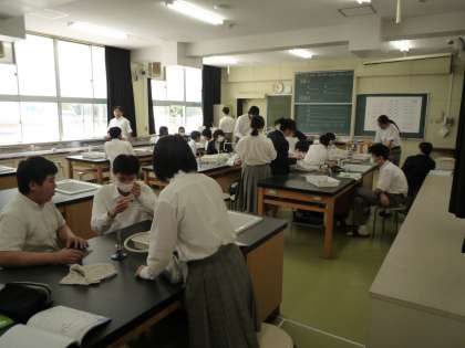 8年の理科で化学反応を確かめる実験がありました。班で協力しながら、結果をレポート用紙にまとめていました。