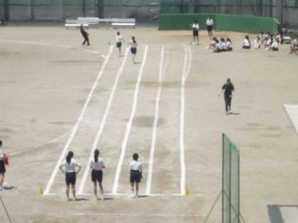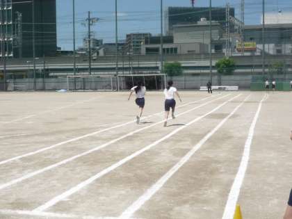 女子は50m走を測定しています。最後まで全力で走り切って頑張っています。