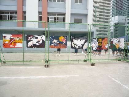 各クラスの学級旗です。どれも素晴らしい旗になっています。左から7年1組、2組、8年1組、2組、9年1組、2組です。