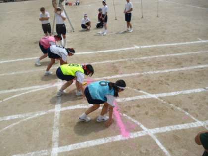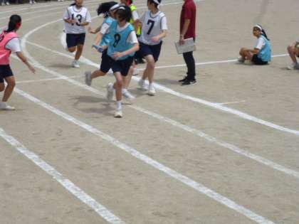 午後からのプログラム。7年生から9年生で結成された縦割りによる女子リレーです。