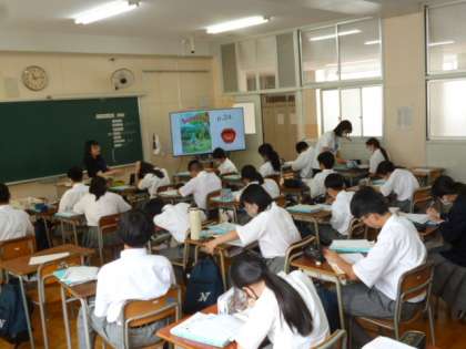 今日の目標は、「すらすらと英文が発音できるようになろう」です、先生の後に続いて発音頑張っています。