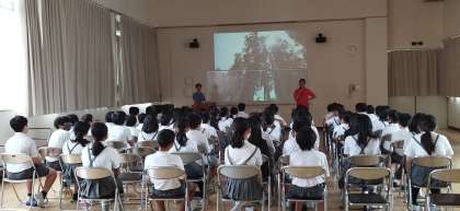 約一ヶ月後に予定している林間学習に向けて、先生の説明を聞いています。