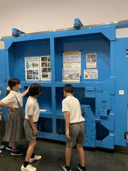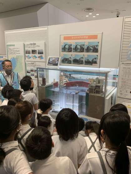 安治川水門の模型を見たり、3.8tの防潮扉のハンドルを回したりしました。